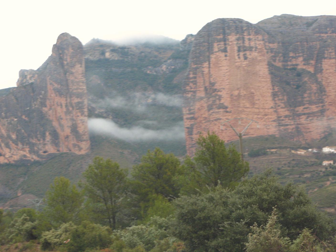 Tras esta comida suculenta seguimos viaje. Llueve y chispea un poco. Paramos en un paraje muy bonito a hacer fotos del río Gállego encajonado y hacemos también fotos a los mallos de Riglos y los de Agüero, a un lado y a otro de la carretera.