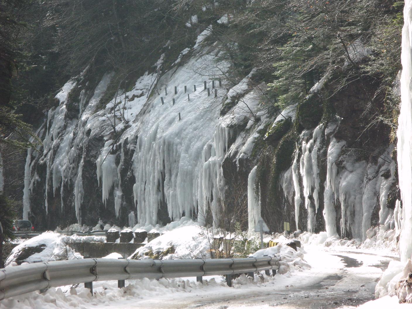 A mitad camino nos tenemos que volver porque la carretera se ha cortado por la caída de unos carámbanos muy grandes que han bloqueado el camino y es peligroso intentar pasar por encima por su altura y que pueden rasgar las ruedas. Al bajar nos encontramos de cara con los forestales y les decimos lo ocurrido. En una explanada esperamos a ver si los forestales logran abrir el camino. Conocemos a un matrimonio valenciano que es forofo de esta zona desde hace muchos años y están hospedados en la pensión de Gaby.