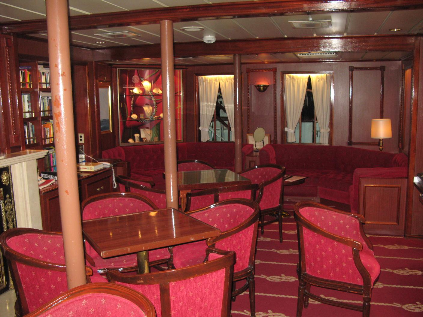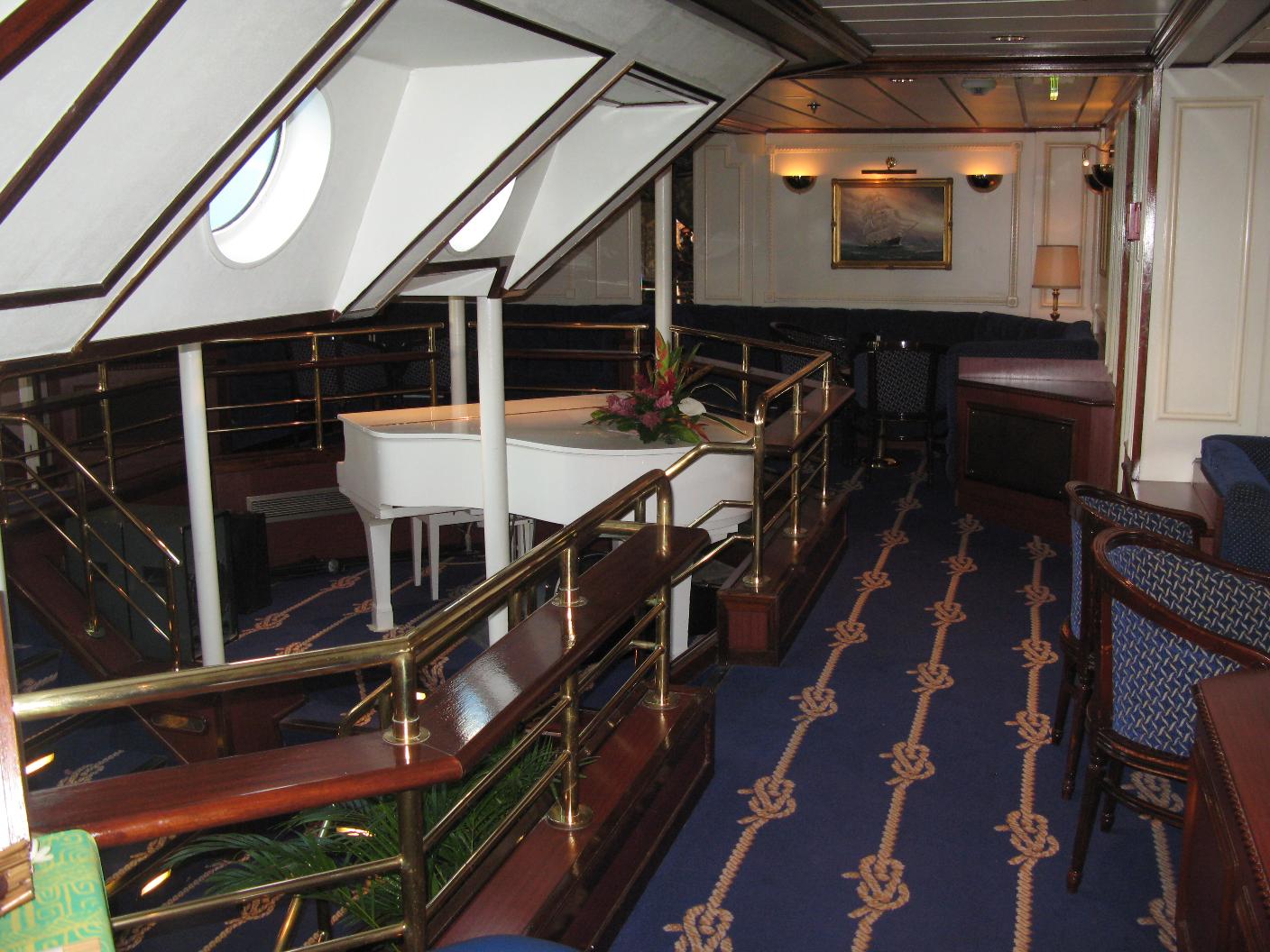 Teníamos bastantes zonas para pasar el tiempo: el Piano Bar con sofás, mesitas y sillas de terciopelo; el Tropical Bar con taburetes y aparte dos mesas altas de madera con sus respectivos taburetes además de bancos de madera rodeando toda esa plataforma; la Biblioteca, con juegos, ordenadores y libros de muchos de idiomas con sofás y mesitas con sillas de terciopelo. Por el resto del barco había dos piscinas, una en popa y otra en la cubierta superior rodeadas de hamacas y de bancos de madera.