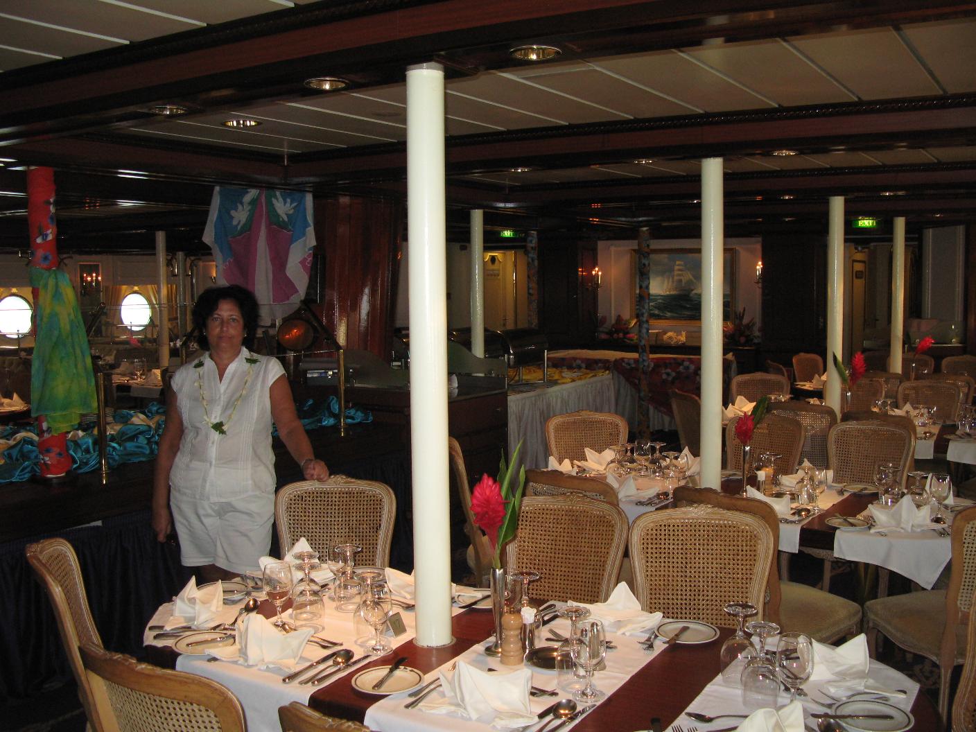 La seguridad en el barco dejó bastante que desear. No porque el barco no fuera seguro, sino porque quizá fue la primera vez que encontraron unos vientos tan fuertes y tan seguidos por esos mares, lo que hizo que la tripulación reaccionara tarde en el tema de asegurarlo todo frente al viento y al fuerte mar que tuvimos todo el crucero. Pasaron varios días hasta que se aseguraron con cuerdas las hamacas, bancos, mesas y elementos del restaurante. Se empeñaron en que todo fuera normal y se seguía usando la vajilla de loza y los vasos y copas de cristal, y claro, todo iba por el suelo o a golpes y se rompía. Al final se sacaron los platos y vasos de plástico, que se usan en las barbacoas de la playa, en los días de más movimientos y se procuraba entonces que sólo se movieran por el restaurante los camareros.
