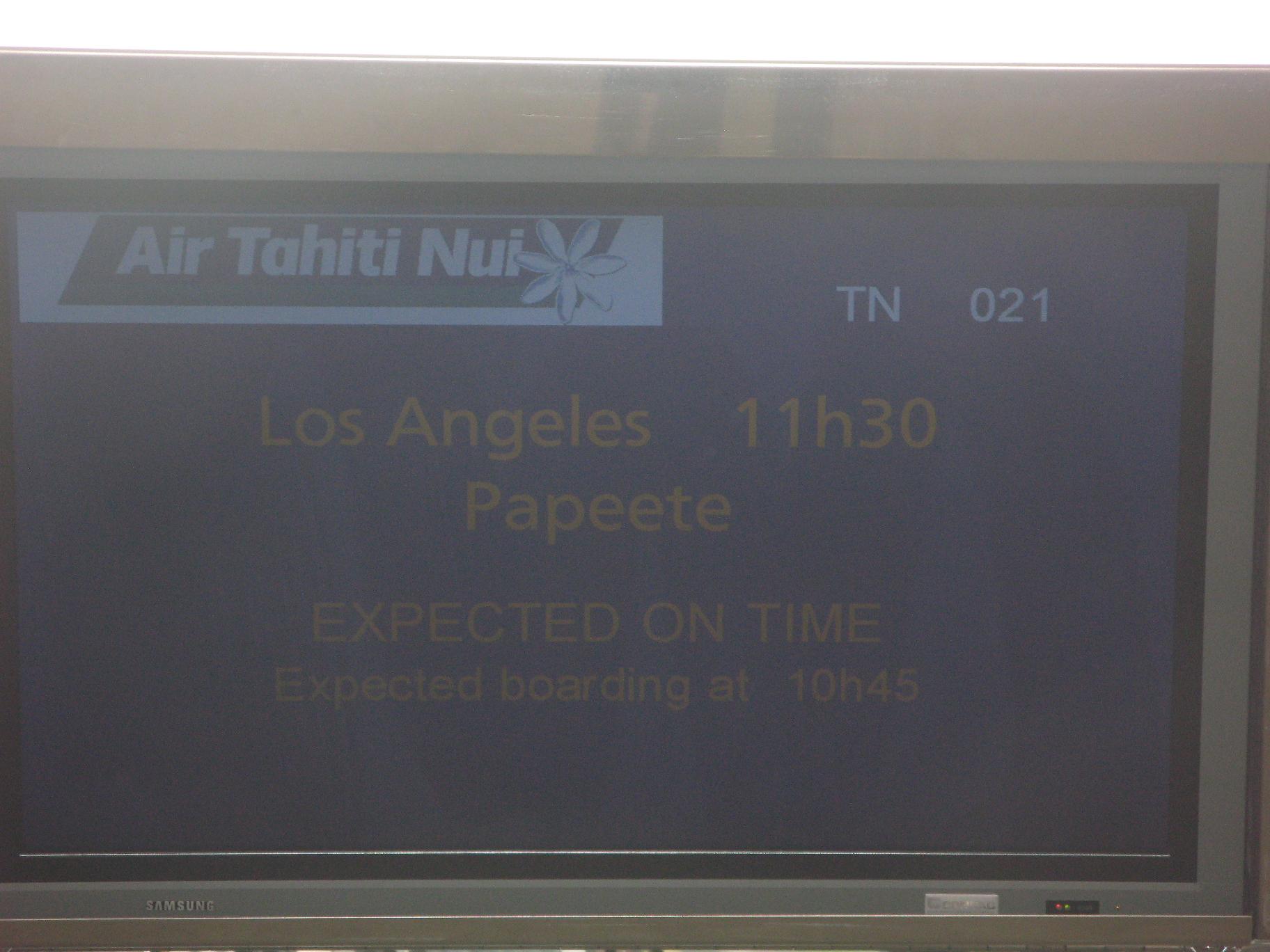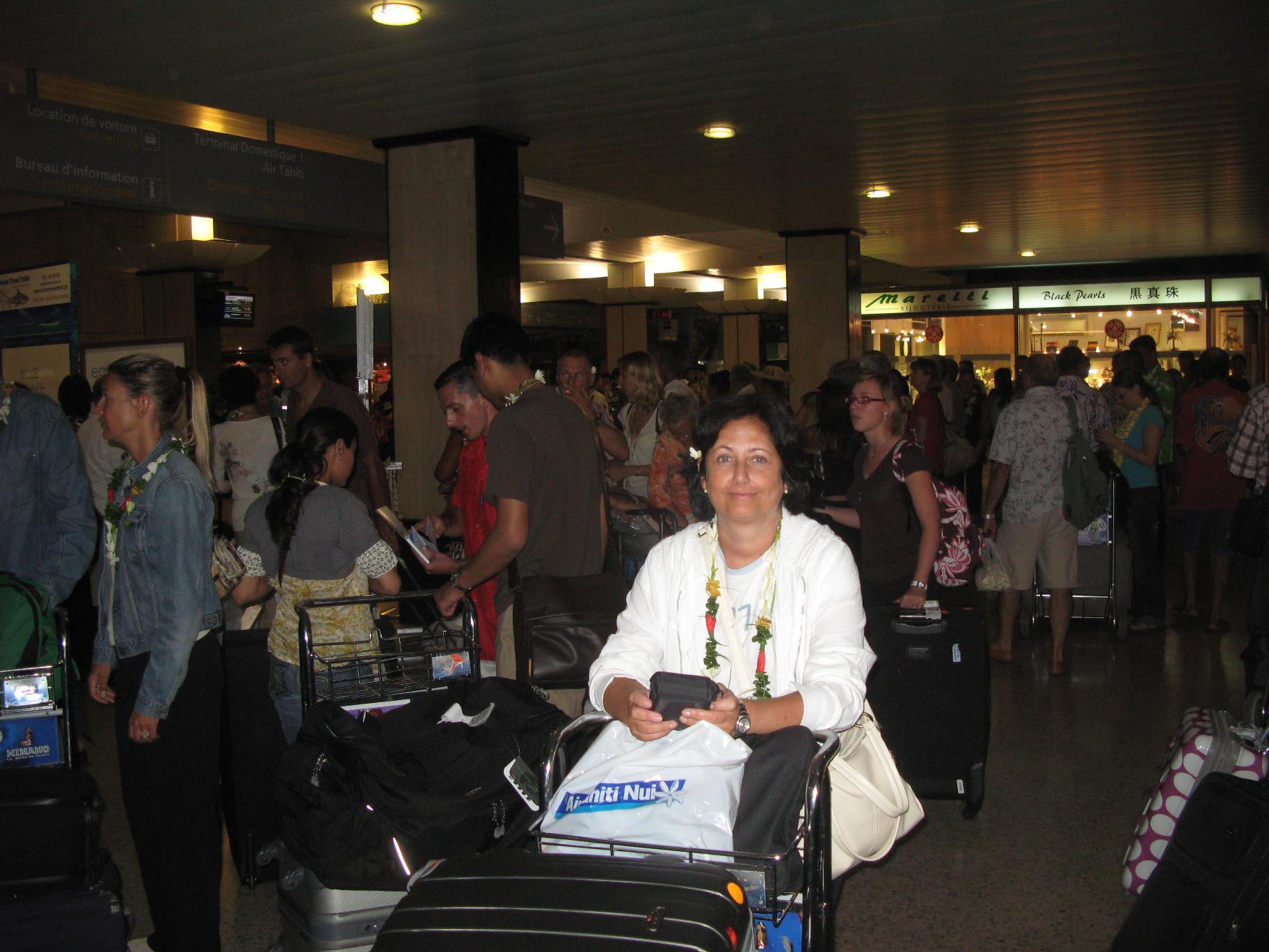 Hacemos un buen desayuno. Nos recoge puntual Anis y nos lleva al Aeropuerto Charles Degaulle. Tras facturar el equipaje y pasar los controles, tomamos un café y un zumo en un barecito, y además echamos un vistazo a las tiendas Dutty Free. Nos llama la atención un grupo muy numeroso de mujeres con niños y jóvenes, de algún país árabe, vestidas todas de occidentales, pero con la particularidad de llevar las cejas totalmente depiladas y tatuadas, para cambiar los rasgos de sus caras. La subida al avión se hizo de manera súper organizada, los minusválidos primero, después las familias con hijos y más tarde por orden de filas. El recibimiento al entrar en el avión era con flores, la típica gardenia tahitiana que se pone en la oreja y que huele parecido al jazmín. La salida del vuelo de Air Tahiti Nui fue puntual. Las azafatas llevaban un uniforme azul muy bonito y los chicos también en azul pero más oscuro y con el cuello mao. Para empezar a servir las bebidas, comidas, snacks, etc, se cambian todos de ropa. Ellas se ponen un vestido midi floreado con volantes y ellos camisas floreadas. Todas llevan el pelo largo recogido en un moño adornado con flores. No pararon de ofrecernos bebidas de todas clases, comimos dos veces , merendamos, desayunamos, tomamos aperitivos y entre medias, había bandejas de canapés, para cualquiera que quisiera picar entre horas. Repasamos el librito donde venían las excursiones que se pueden realizar y planeamos una preselección de las actividades que nos gustaría hacer en cada parada. Llegamos a Los Ángeles y bajamos del avión. Tras recorrer varios pasillos pasamos por el control de policía, entregando la carta verde que hemos rellenado en el avión, poniendo las huellas y haciéndonos una foto. La policía hablaba español, como muchísima gente en Los Ángeles. Nos hacen subir a una sala de espera y Vicente me compra chicles, pagando en Euros y hablando en español . Lo que faltaba. De entre la gente descubrimos que había unos franceses que también iban al crucero del Star Flyer. Al cabo de una hora nos vuelven a embarcar en el mismo avión, limpio y recogido ya de todos los trastos y con otra tripulación. Por si no habíamos comido suficiente, nos dan de cenar y más tarde un lunch y aperitivos. Como ahora vamos más vacíos, me cojo una fila de cuatro y bajando los reposabrazos, me coloco de forma más o menos cómoda y me duermo un ratito después de leer un poco. Durante todo el viaje llevamos en el asiento de al lado a un señor nativo de la Polinesia, que vive en Moorea y trabaja en Tahití, al que todos le hacían mucho caso. Decía que tenía una hija azafata, pero había algo en él que nos llamaba la atención. Vicente piensa que es como un santón o algo similar. Tras despertarme nos ponemos Vicente y yo a jugar con los juegos del avión, hasta que llegamos al Aeropuerto de Faa,a en Papeete de noche, sobre las 9.30. Una vez recogidas las maletas, nos reciben con música típica y collares de flores. Justo delante de la salida hay una pérgola, bajo la cual se encuentran muchas mujeres delante de cestas de flores, confeccionado los collares. |