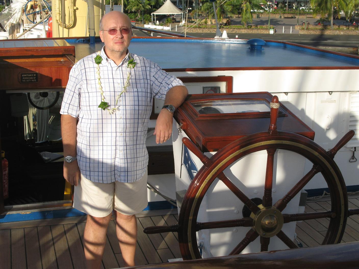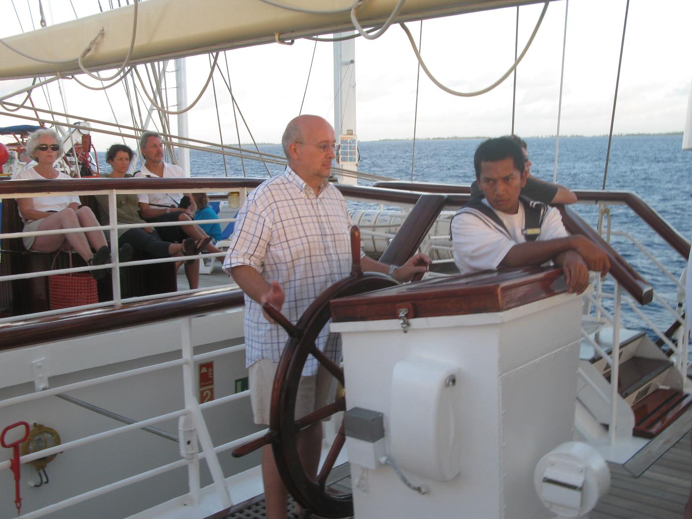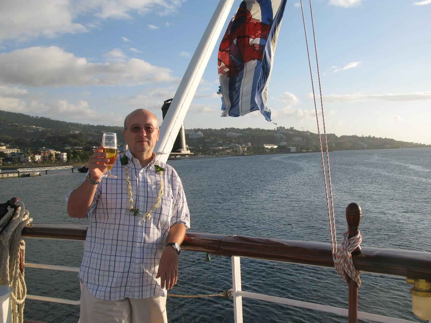 La noche ha sido muy movida. El barco cabeceaba mucho así como se balanceaba de lado a lado. Vicente se ha levantado muy temprano para ver el amanecer en el mar desde el puente. Yo me he levantado con dolor de cabeza y algo de angustia. Me tomo una Biodramina pero la devuelvo. Bajamos a desayunar y luego subimos a cubierta de proa a tomar el aire. Paso la mañana leyendo y tomando el sol. Vicente se hace amigo de los oficiales y se dedica a establecer el rumbo con su Asus y a hacer fotos. Aunque Dulce no se encuentra muy bien por eso del mareo, para mi ha sido una experiencia inolvidable eso de poder navegar por los Mares del Sur en pleno Océano Pacífico y a bordo de un maxi velero como el Star Flyer, sin duda alguna una de las experiencias vitales que más deseaba tener. El ver mi primera salida y puesta de Sol en el Pacífico Sur y navegar rodeado de millas y millas de mar con el suave y acompasado balanceo de este clipper, seguro que no lo olvidaré nunca. A las 10 hacemos un ejercicio de simulacro para saber cada uno a donde acudir en caso de emergencia. Bajamos a comer. Al mediodía es tipo Buffet Italiano, muy completo. Vamos a dormir la siesta después. Hay actividades en el Tropical Bar pero como no ando muy bien, me las pelo. Vicente se da una vueltecita para enterarse. A la hora de cenar ya es a la carta y nos sentamos con los franceses. Tras la cena, nos damos un paseíto por el barco y nos retiramos a dormir. Una vez ya en la cama, me entra angustia y me levanto a toda prisa a devolver todo lo que había comido durante el día y no lo había digerido. Una vez vacía ya se me pasa el mareo.. |