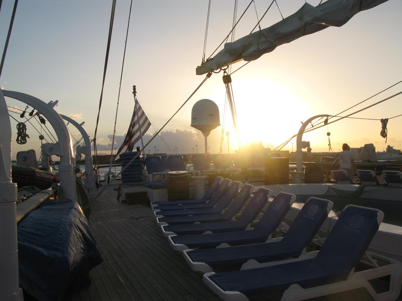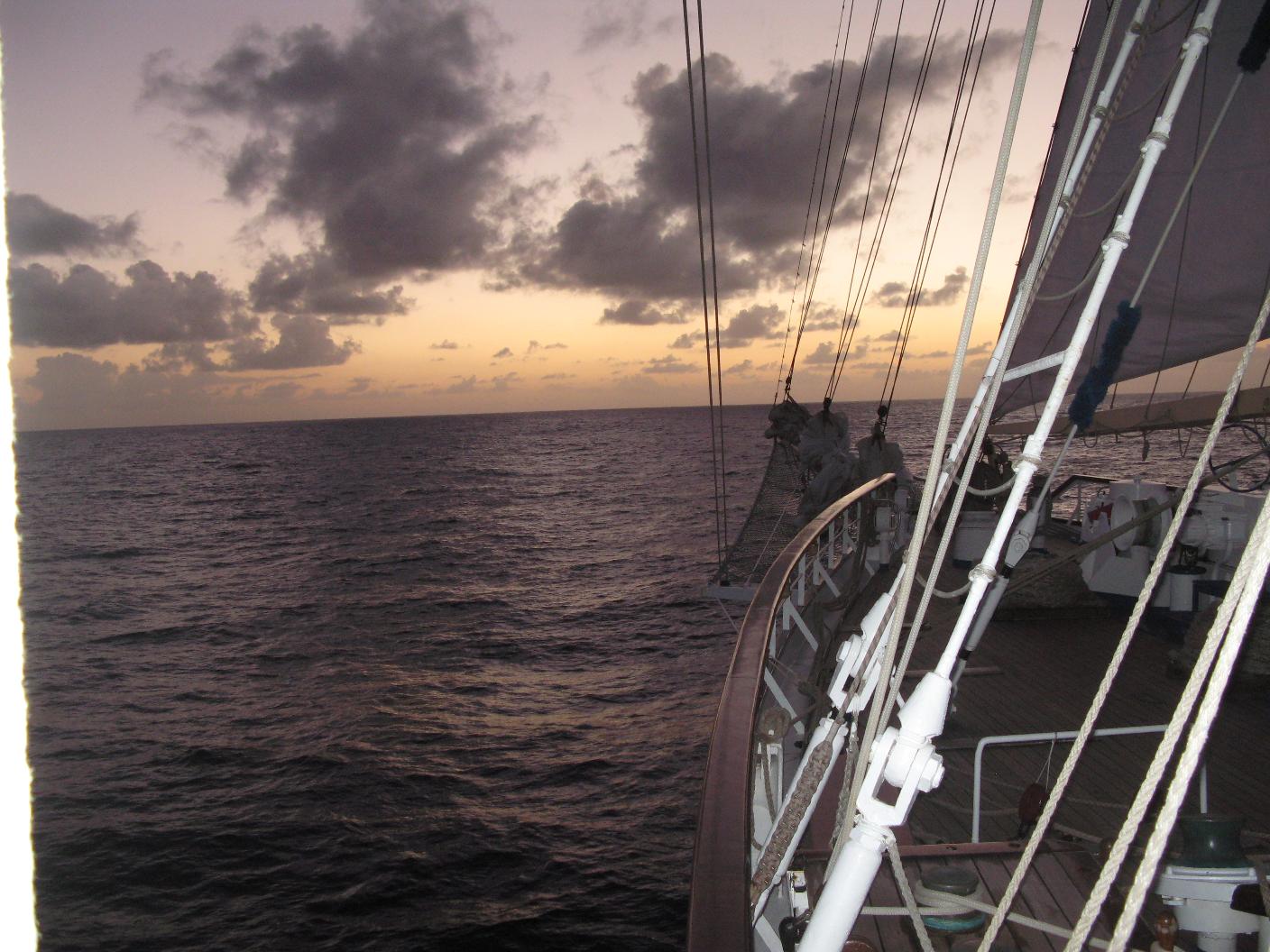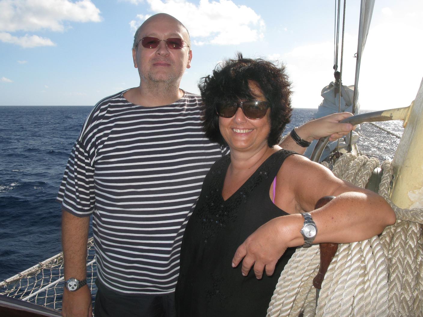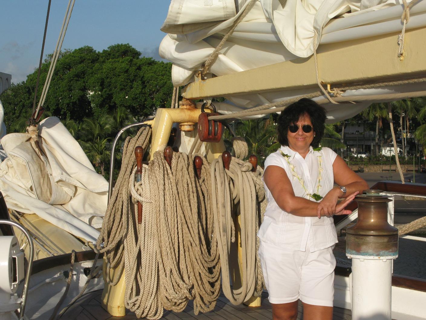 La noche ha sido muy movida. El barco cabeceaba mucho así como se balanceaba de lado a lado. Vicente se ha levantado muy temprano para ver el amanecer en el mar desde el puente. Yo me he levantado con dolor de cabeza y algo de angustia. Me tomo una Biodramina pero la devuelvo. Bajamos a desayunar y luego subimos a cubierta de proa a tomar el aire. Paso la mañana leyendo y tomando el sol. Vicente se hace amigo de los oficiales y se dedica a establecer el rumbo con su Asus y a hacer fotos. Aunque Dulce no se encuentra muy bien por eso del mareo, para mi ha sido una experiencia inolvidable eso de poder navegar por los Mares del Sur en pleno Océano Pacífico y a bordo de un maxi velero como el Star Flyer, sin duda alguna una de las experiencias vitales que más deseaba tener. El ver mi primera salida y puesta de Sol en el Pacífico Sur y navegar rodeado de millas y millas de mar con el suave y acompasado balanceo de este clipper, seguro que no lo olvidaré nunca. A las 10 hacemos un ejercicio de simulacro para saber cada uno a donde acudir en caso de emergencia. Bajamos a comer. Al mediodía es tipo Buffet Italiano, muy completo. Vamos a dormir la siesta después. Hay actividades en el Tropical Bar pero como no ando muy bien, me las pelo. Vicente se da una vueltecita para enterarse. A la hora de cenar ya es a la carta y nos sentamos con los franceses. Tras la cena, nos damos un paseíto por el barco y nos retiramos a dormir. Una vez ya en la cama, me entra angustia y me levanto a toda prisa a devolver todo lo que había comido durante el día y no lo había digerido. Una vez vacía ya se me pasa el mareo.. |