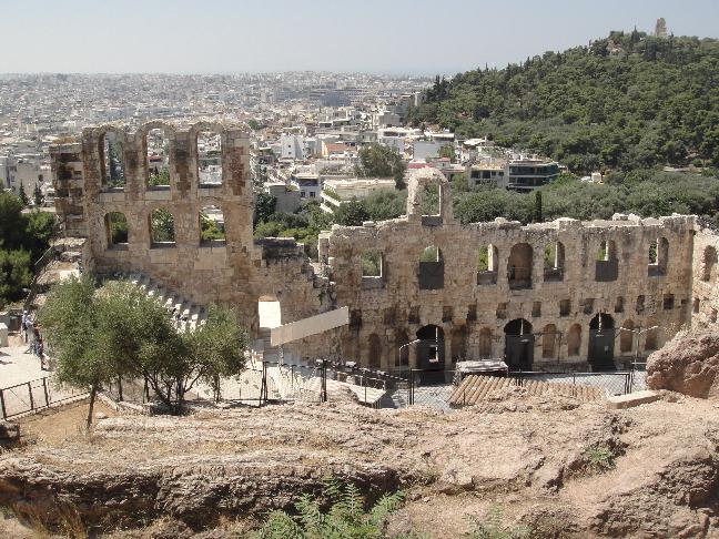 Al lado del teatro se encuentra el Odeón de Herodes Anticus. Es una visión muy espectacular. Fue construido durante la dominación romana entre 161-174 d.C. por el cónsul Herodes Anticus en honor a su esposa Aspasia, fallecida un año antes.