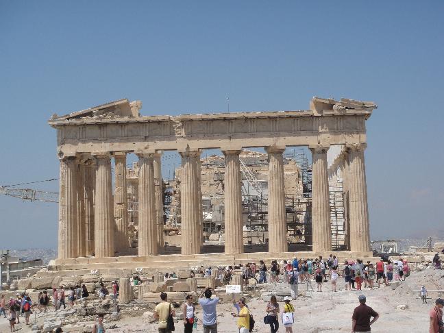 Nada más pasarlos nos encontramos de frente con el Partenón. Es el edificio principal de la Acrópolis. Fidias realizó una colosal escultura de madera, revestida de marfil y oro, de 12 metros de altura, de la diosa Atenea Parthenos(Virgen) y para cobijarla se construyó sobre ella el Partenón sobre un antiguo e inacabado templo.