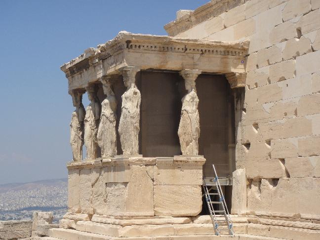 En un lateral se encuentra la Tribuna de la Cariátides, obra de Calímacos, discípulo de Fidias. Consta de seis columnas policromadas con figura de mujer de 2.3 metros de altura. Las que están ahora son réplicas de los originales, de las cuales 5 están en el Museo de la Acrópolis y la 6ª está en el Museo Británico.