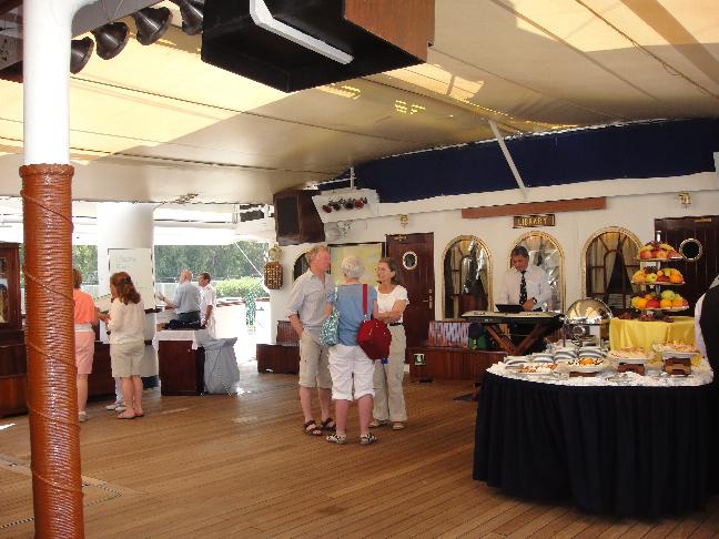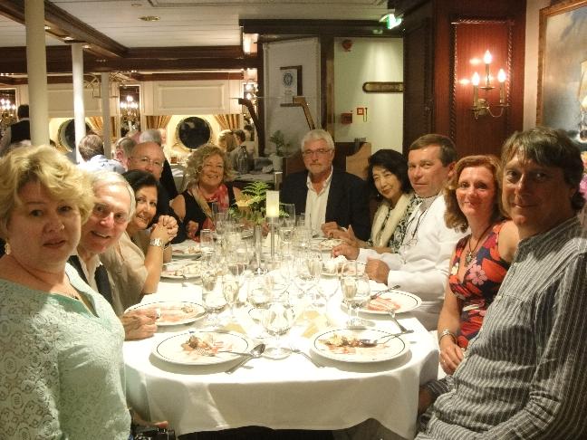 Nos arreglamos y Vicente y yo subimos a la Sun Deck donde el capitán ofrece un cóctel a todos los pasajeros que hayan estado anteriormente en alguno de los tres barcos de la compañía. De los 152 pasajeros de abordo 66 somos “repetidores”.