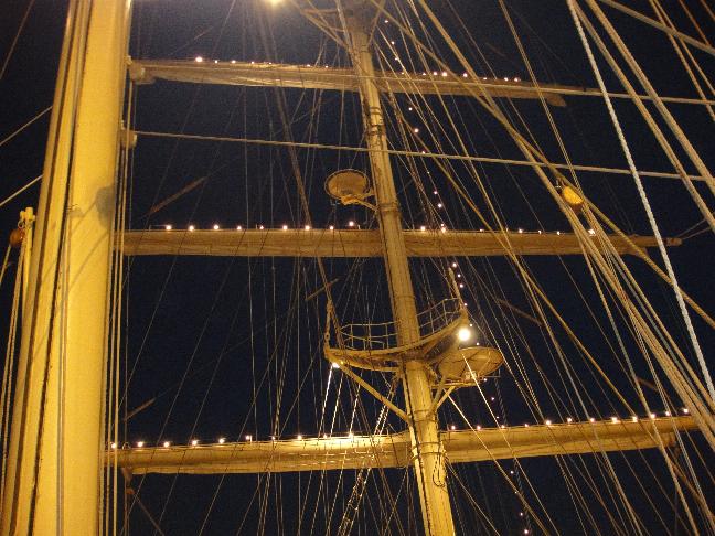 A las 9.45 comenzamos a movernos. Están encendidas todas las luces de los mástiles verticales y horizontales. Muy despacio vamos saliendo del puerto. Una vez fuera de la protección de tierra apagan las luces y comienzan a izar las velas con la música de fondo de Vangelis, 1492. Es algo embriagador. Por un lado el silencio del mar, por otro la grandiosidad de la música y además lo que vemos a nuestro alrededor. Hay casi luna llena de un espectacular color rojo. A media que se va elevando en el cielo deja un hermoso reflejo en el agua y de fondo está la silueta de la Acrópolis iluminada. Parece una aparición que sale de la nada. Al no haber ya contaminación lumínica se ven millones de estrellas en un cielo totalmente despejado. Como va aumentando la velocidad del barco, también se nota más la brisa fresca y reconfortante. Tras disfrutar del momento vivido, nos bajamos a la Biblioteca a apuntarnos a las excursiones. De momento nos apuntamos a tres.