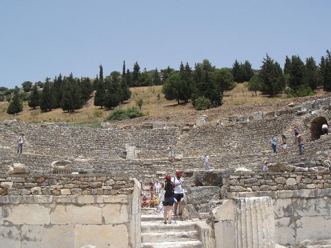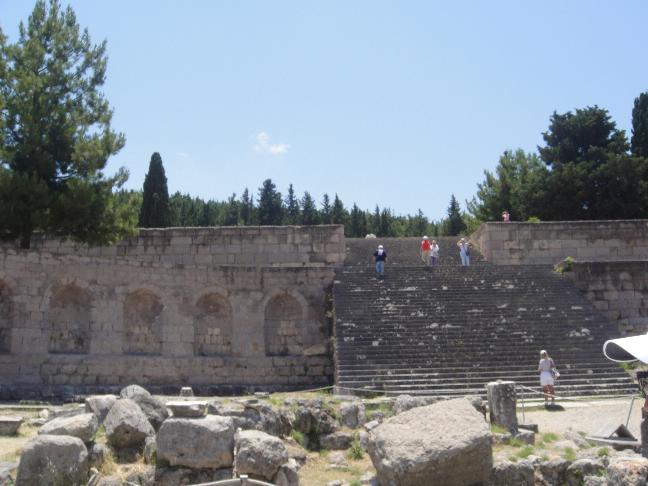 A medida que vamos ascendiendo, con un calor sofocante, nos encontramos con el Teatro de Dionisos. Fue considerado el mayor teatro de la antigua Grecia. Está situado en la ladera sureste de la colina y está dedicado a Dionisos, dios del vino, el teatro y las fiestas.