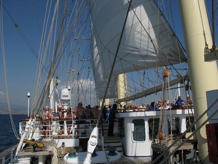 Volvemos al barco a descansar y ducharnos y subimos más tarde a la merienda. Un poco más tarde el barco zarpa. Hoy han sacado casi todas las velas porque el mar está como un espejo y no sopla nada de aire.