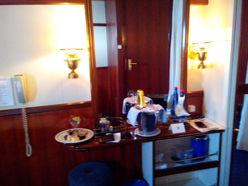 La sorpresa es que nos han dejado una botella de Champán, una cesta de frutas y una bandejita de dulces como bienvenida por ser “repetidores” en los barcos de la compañía.